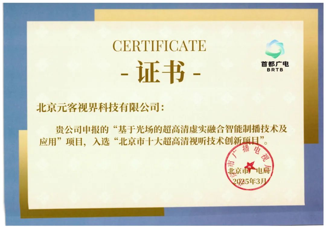 3月30日,在2025中关村论坛年会超高清视听科技创新发展论坛上,北京市广电局发布“北京市十大超高清视听技术创新项目”。经过技术评测、专业评测、现场评测和综合评审,元客视界以“基于光场的超高清虚实融合智能制播技术及应用项目”获得这一殊荣。